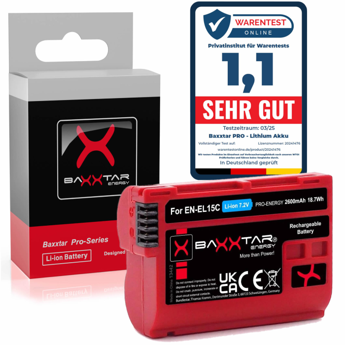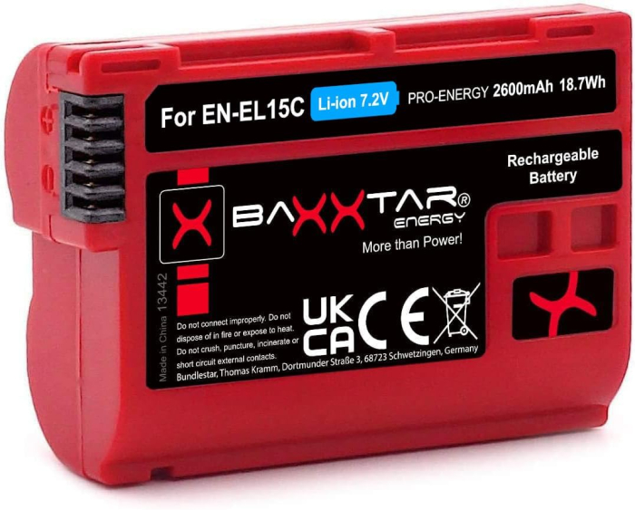 Ideal pentru deplasari: acumulator Baxxtar Pro Li-ion EN-EL15C cu 2600 mAh și tensiune de 7,2 V nu este deloc inferior celui original și este partenerul dvs. de incredere, fie acasa, fie in deplasare.